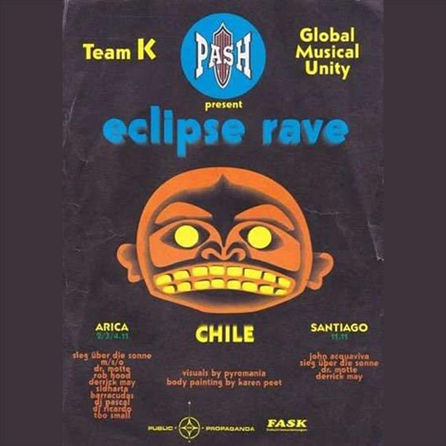 One of the earliest and most symbolic moments took place in northern Chile. In 1994, in Arica, a rave was held that is now considered foundational to the local electronic scene, organized by pioneer Miguel Bustos. In a context where infrastructure and audience were virtually nonexistent, artists such as Dandy Jack, Ricardo Villalobos, and international figures like Derrick May participated in a gathering that also included projects like Sieg Über Die Sonne, expanding the boundaries between performance, art, and sound. More than a massive event, it was a starting point: raw sound, without industry or local references, where the desert landscape, extreme geography, and creative freedom defined a unique experience. This rave not only anticipated what was to come, but established a way of doing things — independent, transnational, and deeply connected to the territory.